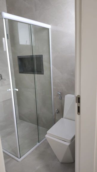 Banheiros completos com móveis planejados, espelhos e boxes.