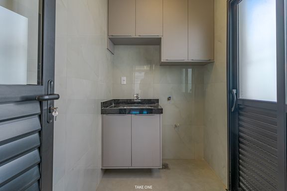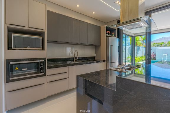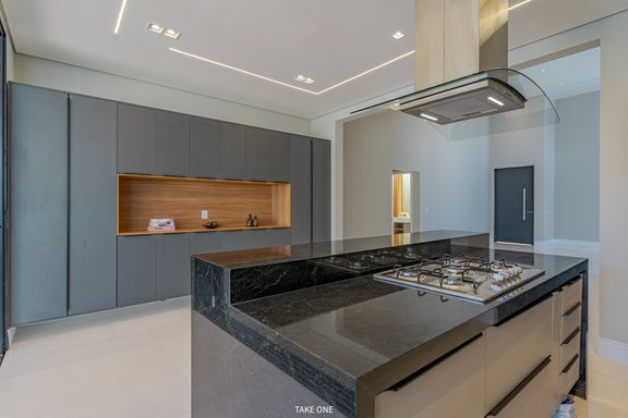 A cozinha é um dos grandes destaques do imóvel: possui armários planejados, oferecendo organização e praticidade, além de estar equipada com cooktop, coifa e forno. A integração com a ampla área gourmet, também planejada e equipada, proporciona um espaço perfeito para receber convidados com conforto.