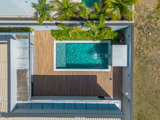 A área externa conta com uma bela piscina com cascata, ideal para momentos de lazer e relaxamento. As persianas elétricas instaladas nos dormitórios garantem praticidade, controle de luminosidade e um toque extra de sofisticação. A área de serviço também possui armários sob medida, garantindo funcionalidade no dia a dia.