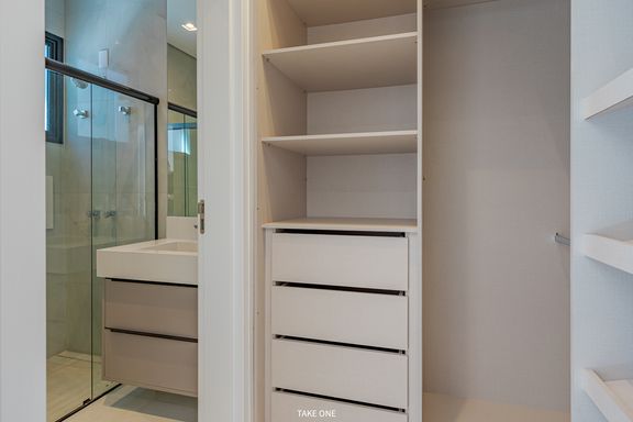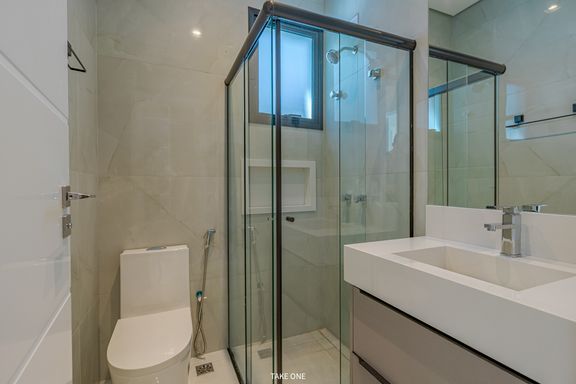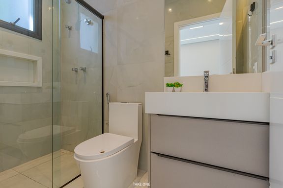 A área íntima dispõe de 4 suítes espaçosas, todas com excelente ventilação e iluminação natural. Há também a opção de configurar o imóvel com 3 suítes + escritório, ideal para quem trabalha em home office ou deseja um ambiente reservado para estudos. Os banheiros são completos, equipados com boxes de vidro temperado e acabamentos de qualidade.